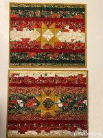 Látky můžete náhodně střídat- vznikne obrazec výše. Nebo je možné je uspořádat do paprsků stejné barvy, jako je na obrázku v rozvrhu hodin. Spotřeba látek se různí podle toho, kde kterou použijete. Doporučujeme 7 látek + střed + borduru, látky cca po 20/30 cm. Budeme rádi, když si látky nakoupíte u nás na začátku kurzu.